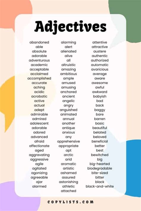 So there you have it, guys! Adjectives are your secret weapon for making your writing shine. They add description, color, and life to your sentences. From the simple “a red car” to the more complex “an enchanting , ancient , forgotten forest,” adjectives allow you to paint vivid pictures and convey precise meanings. We’ve covered what they are, why they’re vital, and explored various types with plenty of examples. Remember to place them thoughtfully, avoid common mistakes, and most importantly, have fun with them! The more you practice using descriptive words, the more natural and powerful your writing will become. Go forth and describe away!