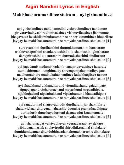 Hey everyone! Today, we’re diving deep into the spiritual and lyrical beauty of Aigiri Nandini . This ancient Sanskrit devotional hymn is a powerful ode to Goddess Durga, celebrating her victory over the demon Mahishasura. You’ve probably heard it, and maybe even felt its resonant energy, but understanding the lyrics in English can unlock a whole new level of appreciation for this divine composition. So, grab your favorite chai, get comfy, and let’s explore the meaning behind those sacred verses together, guys. This isn’t just about translating words; it’s about connecting with the essence of feminine power and divine grace.