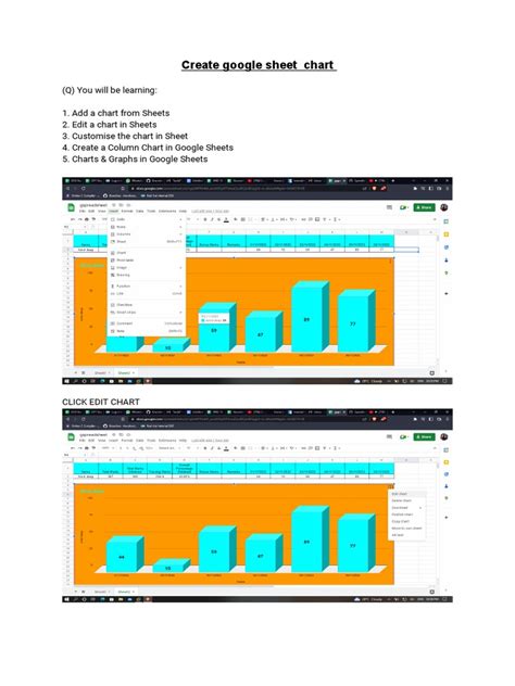 • Charts and Graphs: Visualizing your data with charts and graphs can help you identify trends, patterns, and outliers. Google Sheets offers a variety of chart types, including column charts, bar charts, line charts, pie charts, and scatter plots. To create a chart, select the data you want to visualize, click the “Insert” menu, and choose “Chart.” Google Sheets will automatically suggest a chart type based on your data, but you can customize it to your liking.