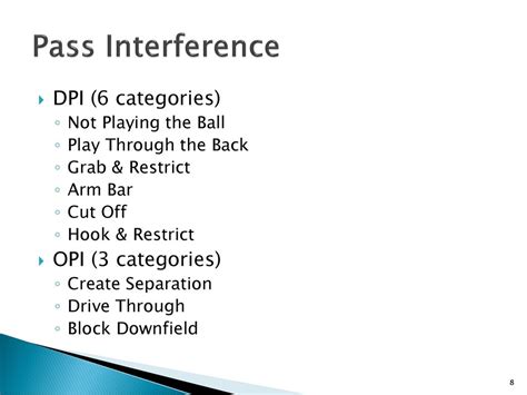 Defensive Pass Interference (DPI) is arguably the most common and often the most debated type of pass interference. It occurs when a defensive player illegally interferes with an eligible receiver’s opportunity to catch a forward pass. DPI can involve a variety of actions, including: