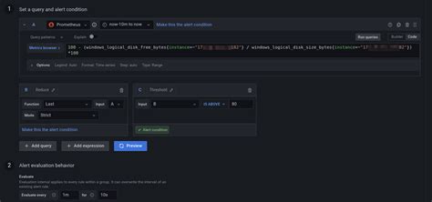 • Conditions : Define the conditions that must be met for the alert to fire. This typically involves setting thresholds for your metrics (e.g., “WHEN avg() OF query(A, 5m, now) IS ABOVE 80”).