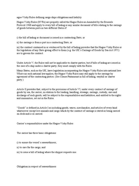 To fully grasp the Hague-Visby Rules, it’s important to understand its key provisions and the amendments that have shaped its current form. The original Hague Rules, established in 1924, laid the groundwork for international maritime law. However, as global trade evolved, it became necessary to update these rules to reflect modern practices and address emerging issues. The 1968 Visby Amendments significantly improved the original rules by increasing the carrier’s liability limits, clarifying the application of the rules to bills of lading, and introducing the concept of package limitation. This means that the carrier’s liability for loss or damage to goods is capped at a certain amount per package or unit, which is crucial for understanding the financial implications of shipping contracts. Further amendments were made in 1979 through the SDR Protocol, which changed the unit of account for liability limits to Special Drawing Rights (SDRs). SDRs are an international reserve asset created by the International Monetary Fund (IMF), providing a more stable and globally recognized standard for liability calculation. These amendments collectively ensure that the Hague-Visby Rules remain relevant and adaptable to the ever-changing landscape of international trade. Understanding these changes is vital for legal professionals and anyone involved in the shipping industry, as they impact how contracts are drafted, disputes are resolved, and liabilities are determined. The provisions of the Hague-Visby Rules cover a wide range of issues, including the carrier’s duties and responsibilities, the shipper’s obligations, and the types of claims that can be made in the event of loss or damage. They also address issues such as the time limits for bringing claims and the defenses available to carriers. By understanding these provisions, stakeholders can navigate the complexities of maritime law more effectively and ensure that their rights and obligations are properly protected. Whether you’re a seasoned lawyer or a student just beginning to explore the intricacies of international trade, a thorough understanding of the Hague-Visby Rules and their amendments is essential for success in this field. So, take the time to familiarize yourself with these rules, and you’ll be well-equipped to handle the challenges and opportunities of the global shipping industry.