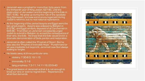 Jeremiah, our main man , was more than just a prophet; he was a deeply emotional and sensitive soul tasked with delivering some seriously tough messages. Living in the late 7th and early 6th centuries BCE, he witnessed the gradual moral and spiritual decline of Judah. Imagine being the guy who has to tell everyone they’re messing up big time! His prophetic ministry began around 626 BCE, during the reign of King Josiah, and continued through the reigns of Jehoiakim, Jehoiachin, and Zedekiah, ending with the fall of Jerusalem in 586 BCE. That’s a long and intense career! Jeremiah’s messages were primarily warnings to the people of Judah to repent from their idolatry, social injustice, and covenant unfaithfulness. He saw firsthand the corruption within the religious and political leadership, which fueled his passionate pleas for reform. Jeremiah’s personal life was marked by suffering and rejection . His messages were not well-received, leading to persecution, imprisonment, and social isolation. Yet, he remained steadfast in his commitment to God’s word, even when it meant facing immense personal hardship. He is often referred to as the “weeping prophet” because of the deep sorrow he expressed over the impending judgment on his people. Despite the grim nature of his prophecies, Jeremiah also offered a message of hope. He spoke of a future restoration and a new covenant that God would establish with his people. This hope provided a beacon of light amidst the darkness of judgment, promising a renewed relationship with God and a return to faithfulness. BibleProject does a stellar job of highlighting these dual themes of judgment and hope, making Jeremiah’s complex narrative accessible and understandable. They break down the historical context, literary structure, and theological significance of the book, providing viewers with a comprehensive understanding of Jeremiah’s role and message. By exploring Jeremiah’s life and prophecies, we gain valuable insights into themes of repentance, justice, and the enduring hope of God’s redemptive plan. It’s not just ancient history; it’s a powerful story that continues to resonate today.