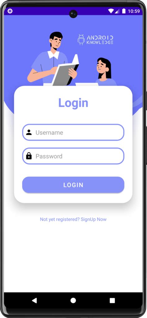 EditTextallows users to enter their username. Theandroid:hintattribute provides a placeholder text, andandroid:inputTypespecifies the type of input (in this case, plain text). -