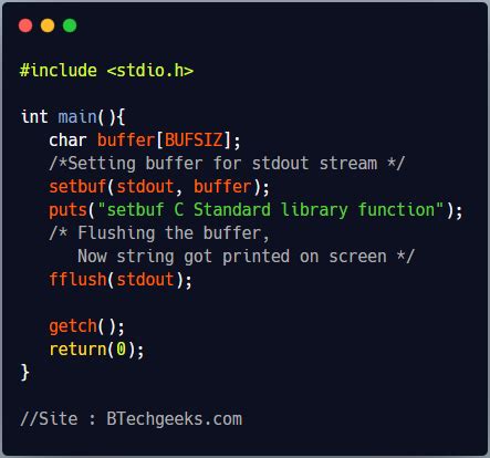 1. Provide your own buffer : You can declare a char array, say char my_buffer[BUFSIZ]; , and pass a pointer to it as the buf argument. The standard library will then use this array as the buffer for the specified stream. This gives you control over the buffer’s memory location, which can be useful in certain advanced scenarios, although it’s less common.